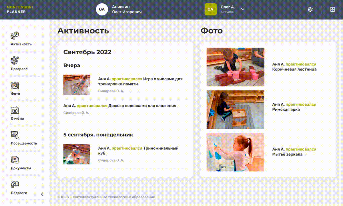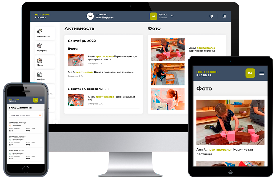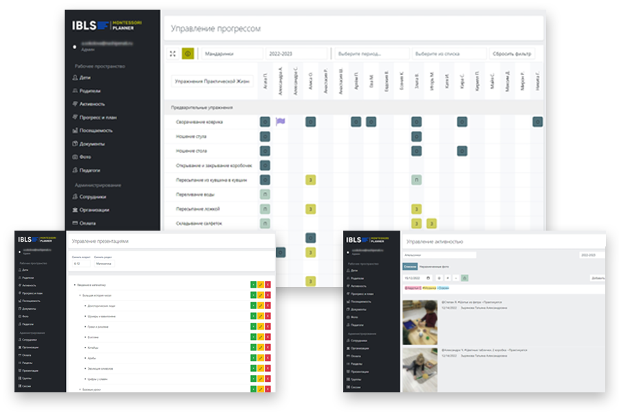 Основные презентации по каждой зоне Монтессори-классов 0-12, различные уровни доступа, учет посещаемости, возможность делать сводные таблицы, графики, загружать фотографии и формировать отчеты, а также — планировать педагогическую работу.